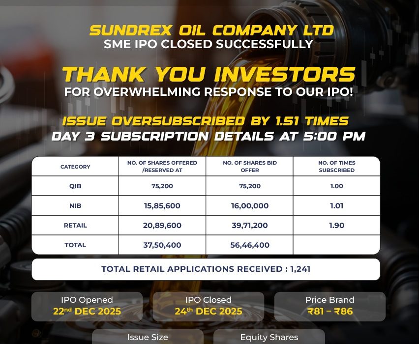 Sundrex Oil Company Limited has successfully closed its SME IPO with an overall subscription of 1.51 times on the final day of the issue, reflecting positive investor sentiment. The retail portion of the issue emerged as the key driver, witnessing an oversubscription of 1.90 times. Bids were received for 39,71,200 equity shares in the retail…