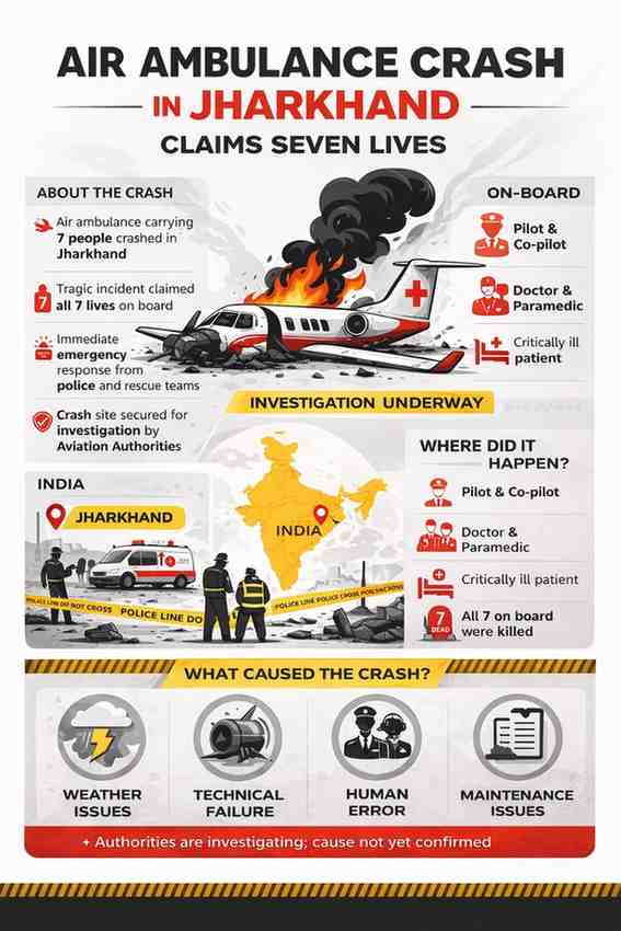 An air ambulance crash in Jharkhand has claimed the lives of seven people, triggering grief across the state and raising serious concerns about aviation safety.