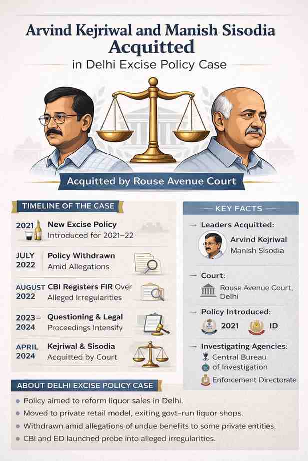 The acquittal of Arvind Kejriwal and Manish Sisodia in the excise policy case by the Rouse Avenue Court marks a key legal development.