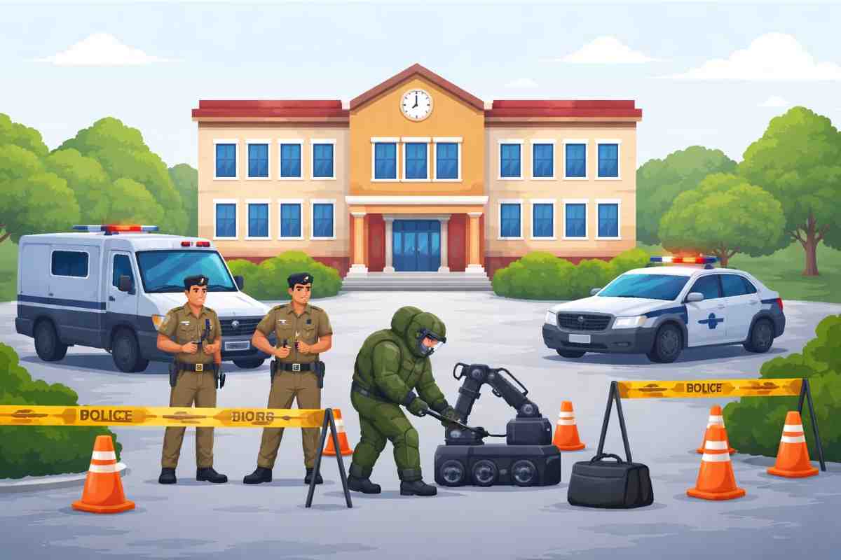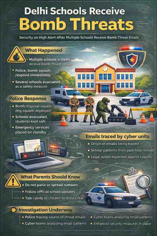 Several schools in Delhi received bomb threat emails on Tuesday, triggering large-scale security checks and causing concern among parents, students, and school authorities. The threats led to swift action by the police and emergency teams, even as officials said no explosives were found during initial searches.