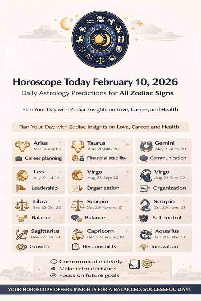 Horoscope Today for February 10, 2026, highlights balance, discipline, and thoughtful planning across all zodiac signs.