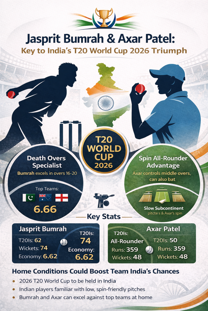 India’s hopes in the ICC Men’s T20 World Cup 2026 may depend heavily on two players who understand home conditions better than most Jasprit Bumrah and Axar Patel. As the tournament approaches, analysts believe the pace-spin combination could play a major role in India’s campaign.