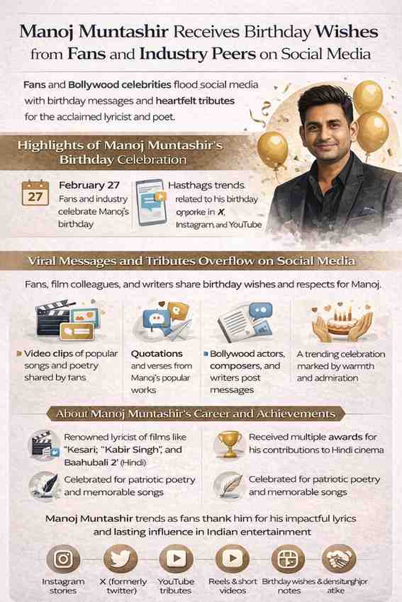 Renowned lyricist and poet Manoj Muntashir received an outpouring of birthday wishes from fans, film personalities, and fellow writers as he marked his birthday on February 27. Social media platforms were filled with greetings, tributes, and appreciation posts celebrating his contribution to Indian cinema and literature.