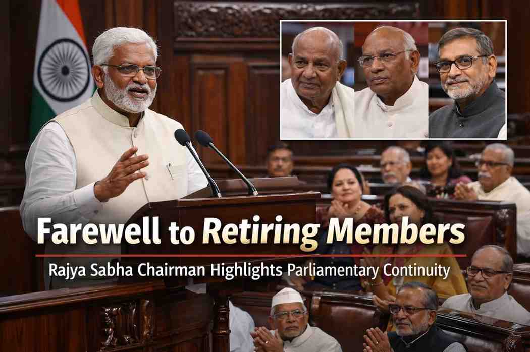 The Chairman of the Rajya Sabha, C. P. Radhakrishnan, on Wednesday delivered a farewell address in the Upper House for 59 members set to retire between April and July 2026.