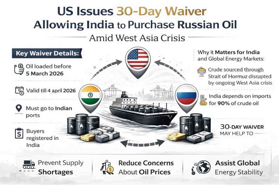 The United States has issued a temporary 30-day waiver allowing Indian refiners to purchase Russian crude oil, a move aimed at stabilising global energy markets during the ongoing West Asia crisis.