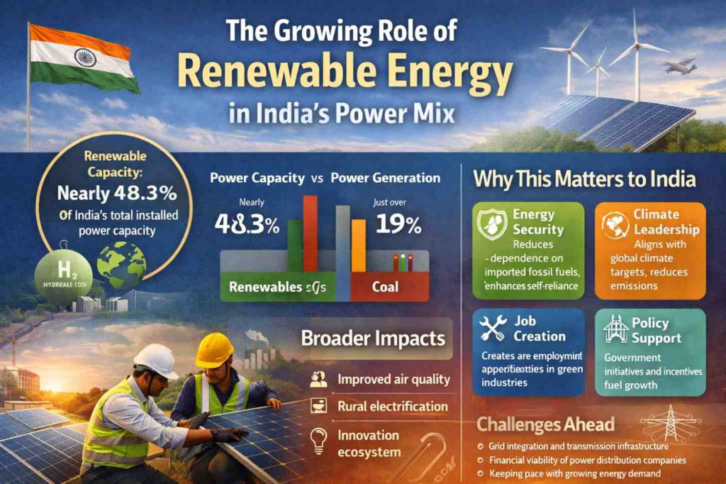 India’s electricity generation landscape has historically been dominated by coal, the workhorse of the grid for decades. While thermal power still accounts for a significant share of generation, renewables — driven by rapid capacity expansion in solar, wind, hydro, and bioenergy — are reshaping that balance. According to official data, renewable energy capacity, including large hydroelectric projects, now constitutes nearly 48.3% of India’s total installed power capacity — a remarkable share in a market that only a decade ago was heavily reliant on fossil fuels.